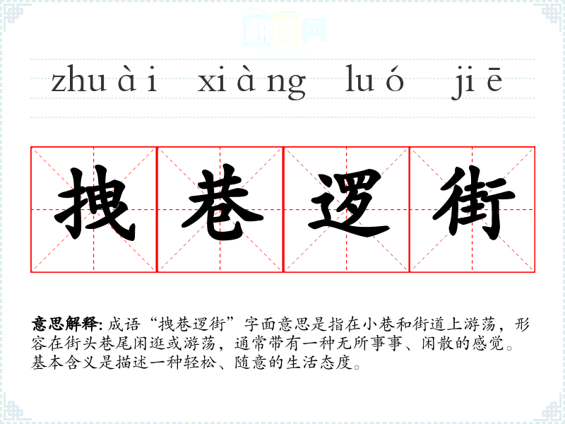成语“拽巷逻街”字面意思是指在小巷和街道上游荡,形容在街头巷尾闲逛或游荡,通常带有一种无所事事、闲散的感觉。基本含义是描述一种轻松、随意的生活态度。