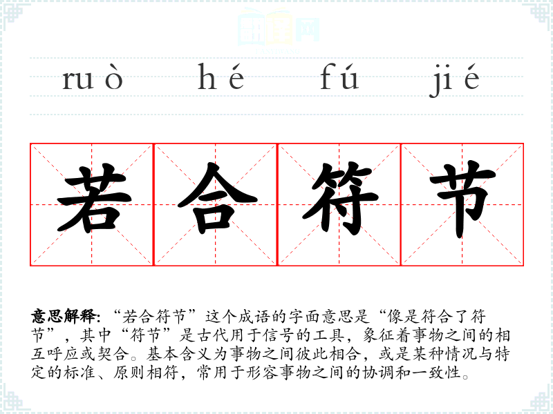 “若合符节”这个成语的字面意思是“像是符合了符节”,其中“符节”是古代用于信号的工具,象征着事物之间的相互呼应或契合。基本含义为事物之间彼此相合,或是某种情况与特定的标准、原则相符,常用于形容事物之间的协调和一致性。