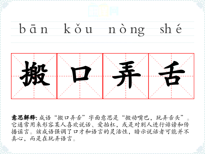 成语“搬口弄舌”字面意思是“搬动嘴巴,玩弄舌头”。它通常用来形容某人喜欢说话、爱抬杠,或是对别人进行诽谤和传播谣言。该成语强调了口才和语言的灵活性,暗示说话者可能并不真心,而是在玩弄语言。