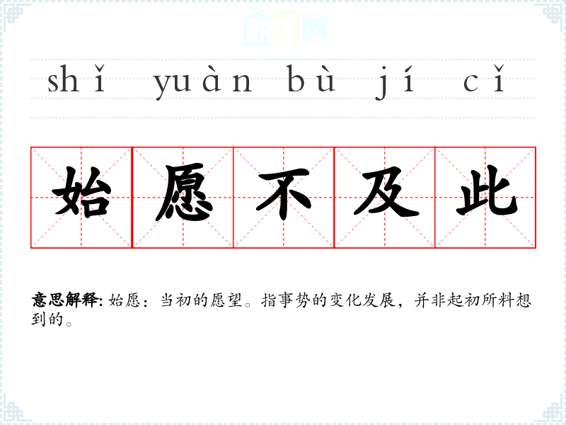 | 始愿不及此 | 始愿:当初的愿望。指事势的变化发展,并非起初所料想到的。 |