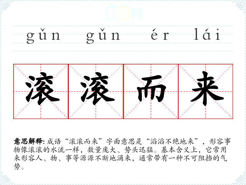 成语“滚滚而来”字面意思是“滔滔不绝地来”,形容事物像滚滚的水流一样,数量庞大、势头迅猛。基本含义上,它常用来形容人、物、事等源源不断地涌来,通常带有一种不可阻挡的气势。