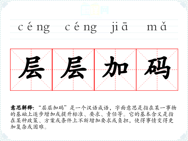 “层层加码”是一个汉语成语,字面意思是指在某一事物的基础上逐步增加或提升标准、要求、责任等。它的基本含义是指在某种政策、方案或条件上不断增加要求或负担,使得事情变得更加复杂或困难。