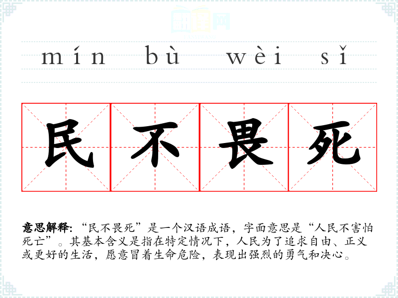 在文化中,“民不畏死”不仅反映了人民对抗压迫的勇气,也体现了对自由和尊严的强烈渴望。在现代社会,尽管生活条件改善,但在某些情况下,如社会或政治抗议中,这一成语依然适用,激励人们追求正义和改变现状。
