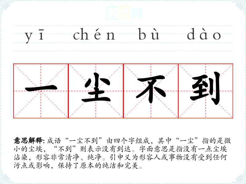 成语“一尘不到”由四个字组成,其中“一尘”指的是微小的尘埃,“不到”则表示没有到达。字面意思是指没有一点尘埃沾染,形容非常清净、纯净。引申义为形容人或事物没有受到任何污点或影响,保持了原本的纯洁和完美。