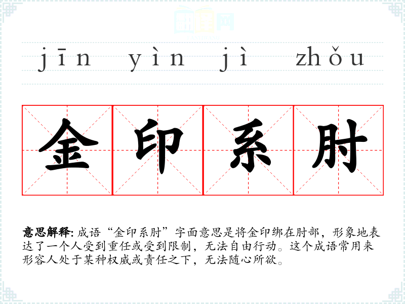 成语“金印系肘”字面意思是将金印绑在肘部,形象地表达了一个人受到重任或受到限制,无法自由行动。这个成语常用来形容人处于某种权威或责任之下,无法随心所欲。