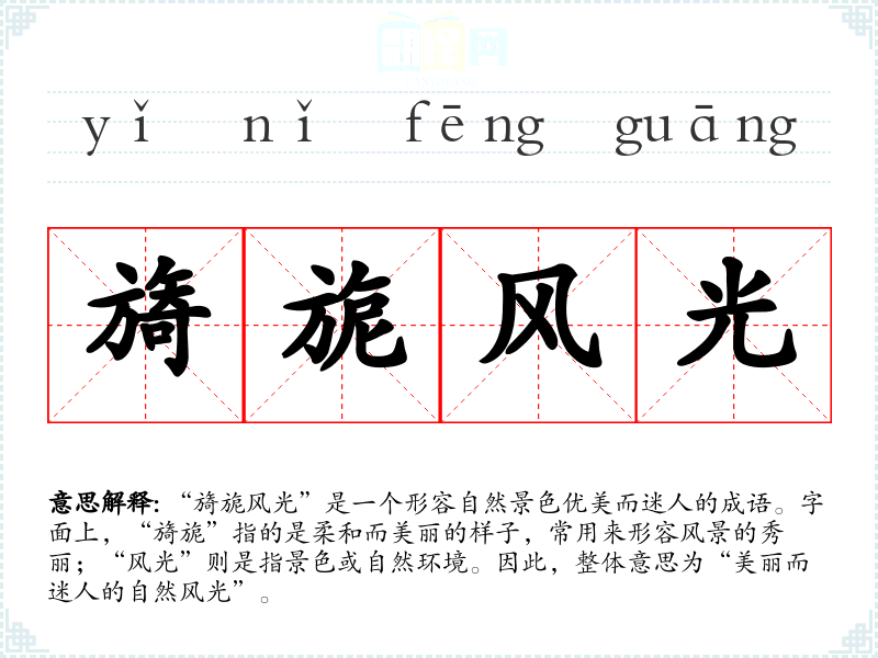 “旖旎”一词源于古代汉语,常用来形容女性的柔美和风景的美丽。“风光”则是一个常用词汇,表示自然景色。虽然这个成语并没有一个特定的历史典故,但它的使用可以追溯到古代诗词中,许多文人墨客在描绘自然景色时,常常会用到“旖旎”这种词汇。