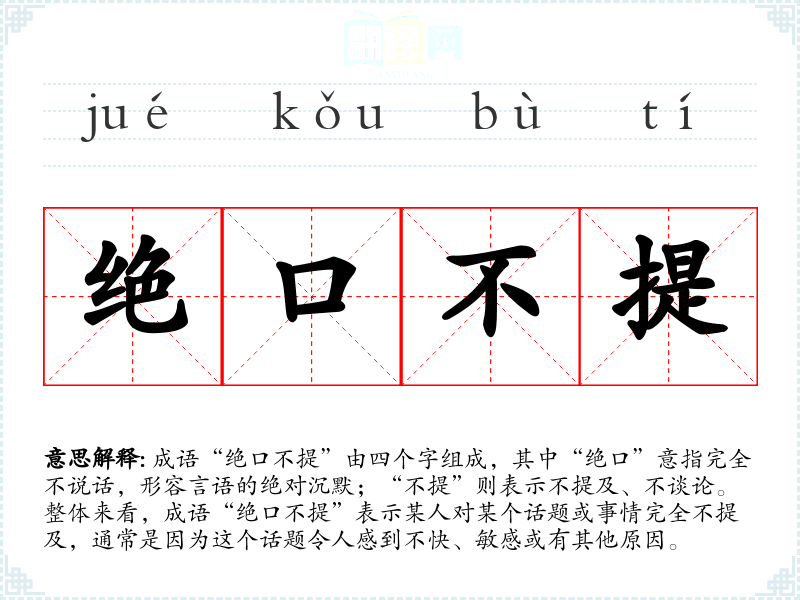 成语“绝口不提”由四个字组成,其中“绝口”意指完全不说话,形容言语的绝对沉默;“不提”则表示不提及、不谈论。整体来看,成语“绝口不提”表示某人对某个话题或事情完全不提及,通常是因为这个话题令人感到不快、敏感或有其他原因。