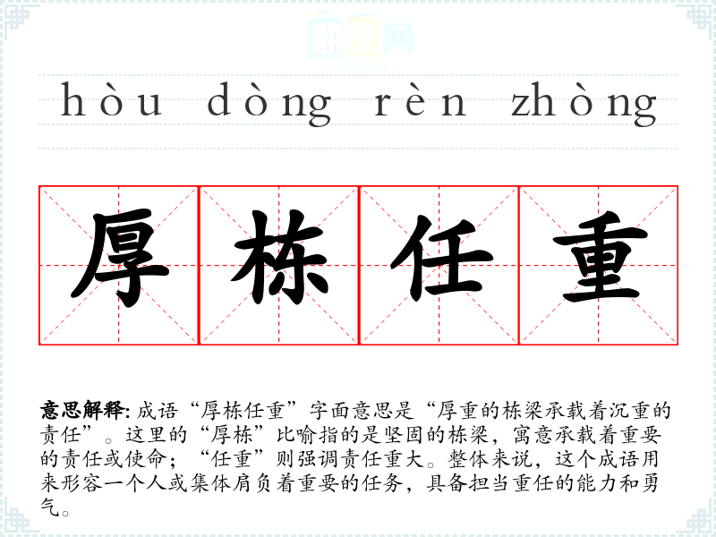 在**传统文化中,责任和担当是非常重要的价值观,尤其在家庭、社会和国家层面。“厚栋任重”反映了对个人能力和责任的期待。在现代社会,这一成语仍然适用于各种领域,如企业管理、社会服务等,强调领导者和团队的责任感。