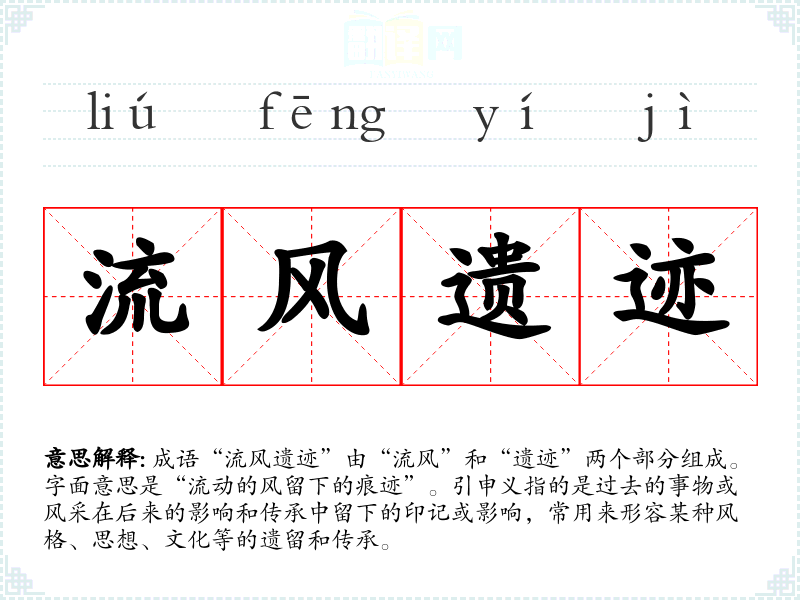 成语“流风遗迹”由“流风”和“遗迹”两个部分组成。字面意思是“流动的风留下的痕迹”。引申义指的是过去的事物或风采在后来的影响和传承中留下的印记或影响,常用来形容某种风格、思想、文化等的遗留和传承。