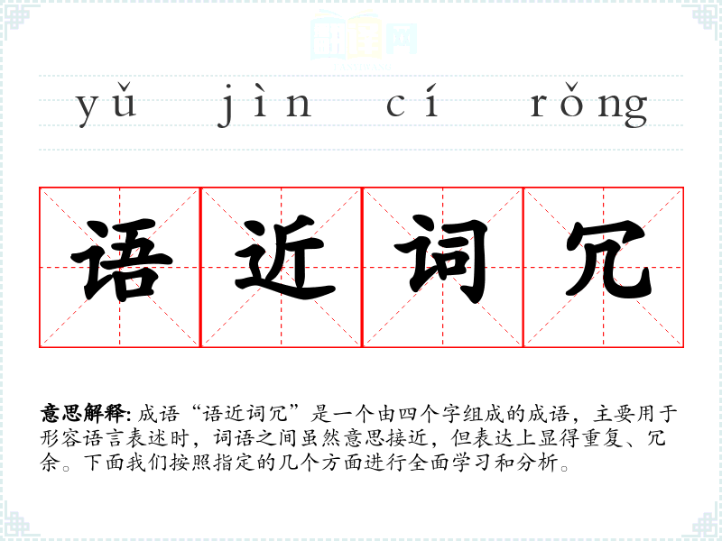 成语“语近词冗”是一个由四个字组成的成语,主要用于形容语言表述时,词语之间虽然意思接近,但表达上显得重复、冗余。下面我们按照指定的几个方面进行全面学习和分析。