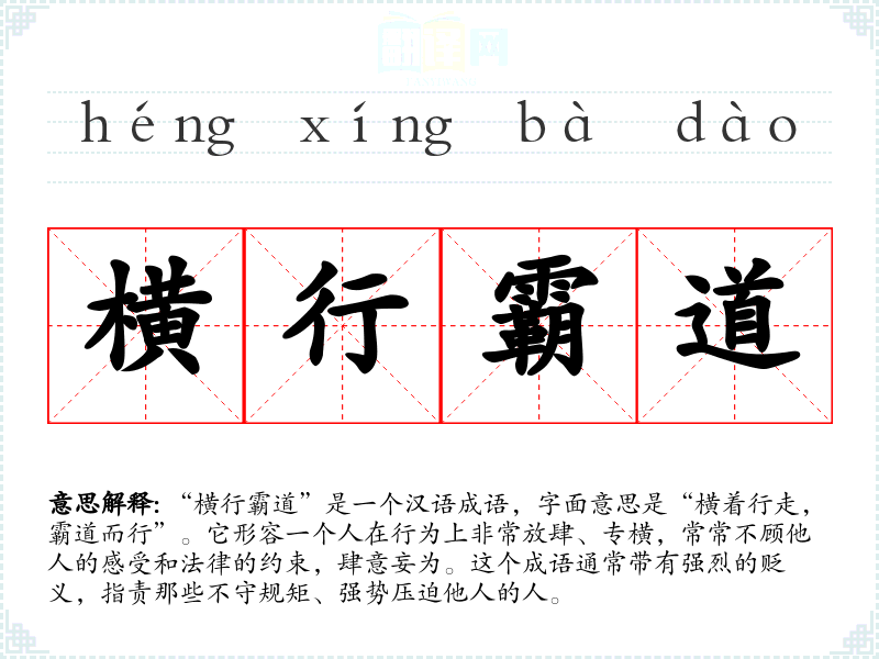 “横行霸道”是一个汉语成语,字面意思是“横着行走,霸道而行”。它形容一个人在行为上非常放肆、专横,常常不顾他人的感受和法律的约束,肆意妄为。这个成语通常带有强烈的贬义,指责那些不守规矩、强势压迫他人的人。
