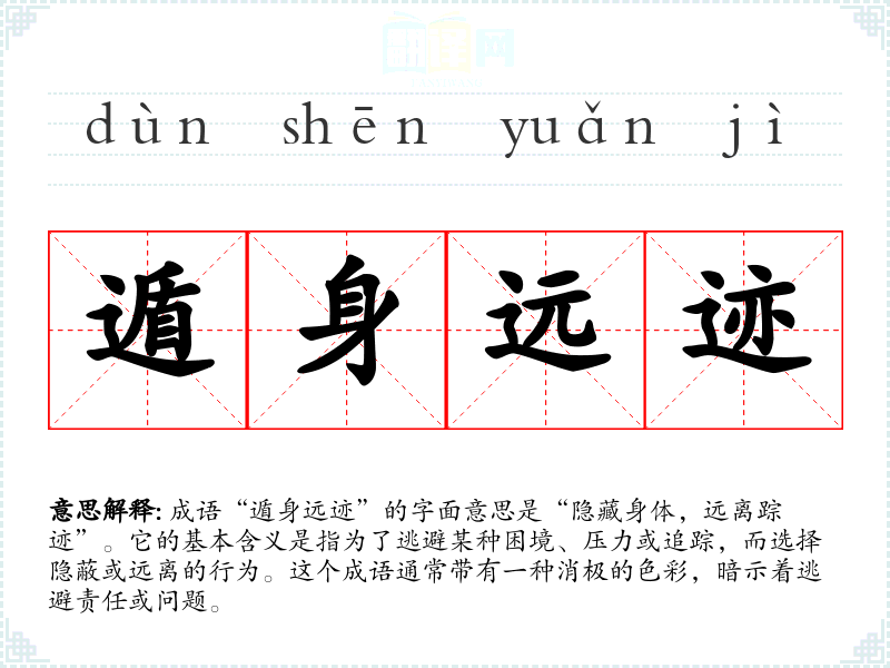 成语“遁身远迹”的字面意思是“隐藏身体,远离踪迹”。它的基本含义是指为了逃避某种困境、压力或追踪,而选择隐蔽或远离的行为。这个成语通常带有一种消极的色彩,暗示着逃避责任或问题。