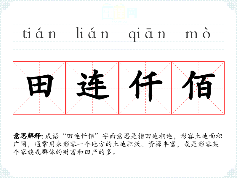 成语“田连仟佰”字面意思是指田地相连,形容土地面积广阔,通常用来形容一个地方的土地肥沃、资源丰富,或是形容某个家族或群体的财富和田产的多。