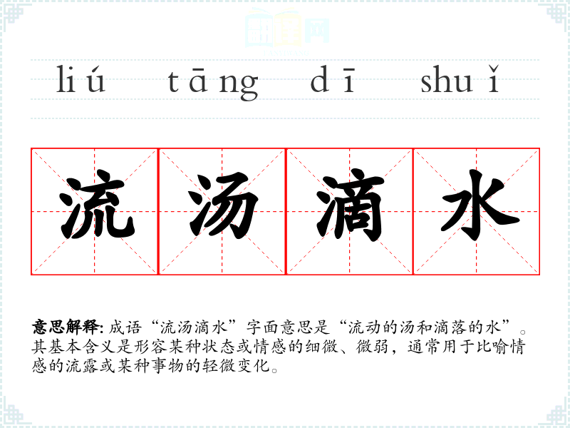 成语“流汤滴水”字面意思是“流动的汤和滴落的水”。其基本含义是形容某种状态或情感的细微、微弱,通常用于比喻情感的流露或某种事物的轻微变化。