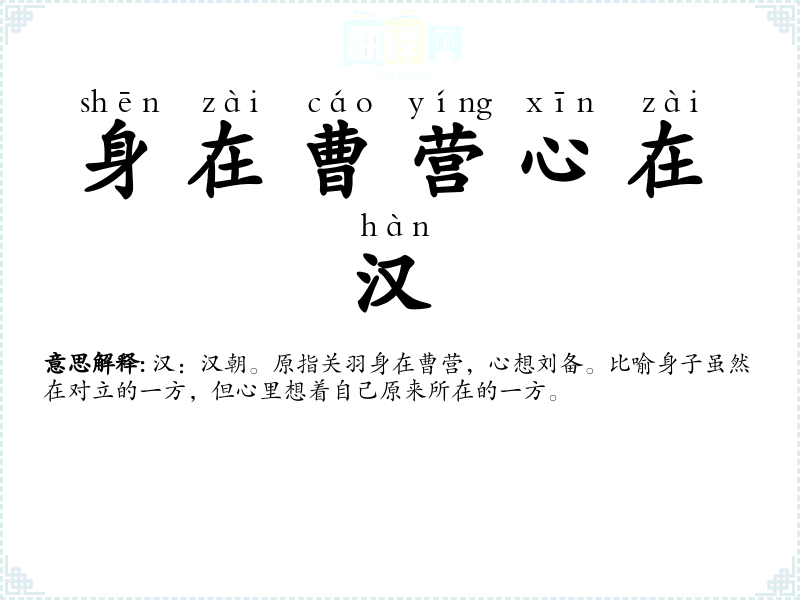 汉:汉朝。原指关羽身在曹营,心想刘备。比喻身子虽然在对立的一方,但心里想着自己原来所在的一方。 |