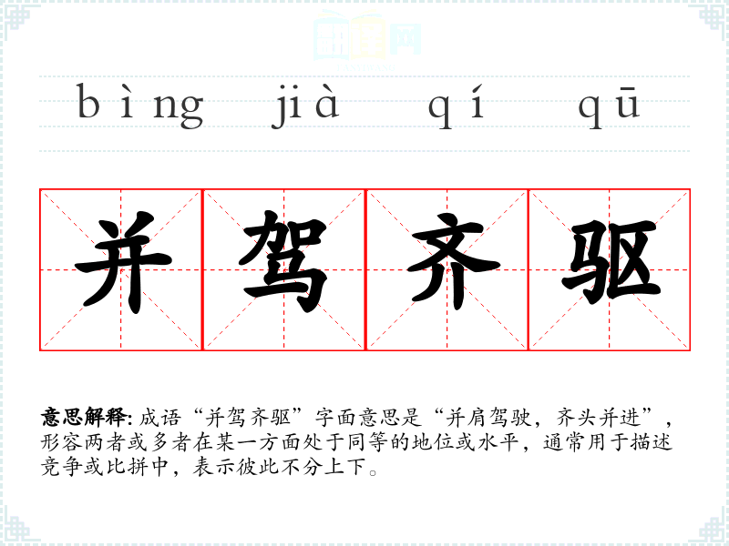 并辔齐驱 辔:驾驭牲口的缰绳;齐驱:一齐快跑。几匹马并排拉着车一齐奔跑。比喻齐头并进,不分前后高低。