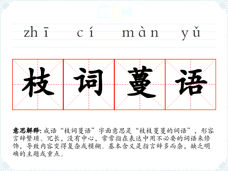 成语“枝词蔓语”字面意思是“枝枝蔓蔓的词语”,形容言辞繁琐、冗长,没有中心,常常指在表达中用不必要的词语来修饰,导致内容变得复杂或模糊。基本含义是指言辞多而杂,缺乏明确的主题或重点。