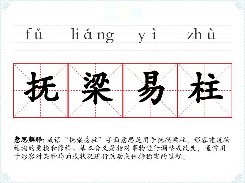 - 同义成语:更改、调整、变革。它们都表示对事物的改变,不过“抚梁易柱”更强调过程中的细致和谨慎。