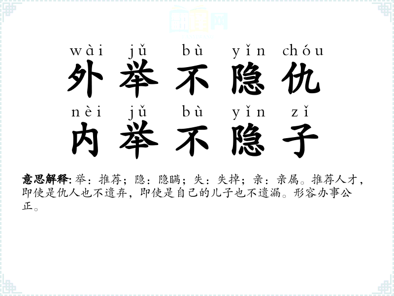 举:推荐。举荐身边的人,即使是亲属也不回避;举荐外面的人,即使是仇敌也不躲开。形容办事公正无私。 |