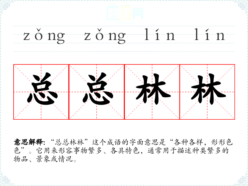 “总总林林”这个成语的字面意思是“各种各样,形形色色”。它用来形容事物繁多、各具特色,通常用于描述种类繁多的物品、景象或情况。