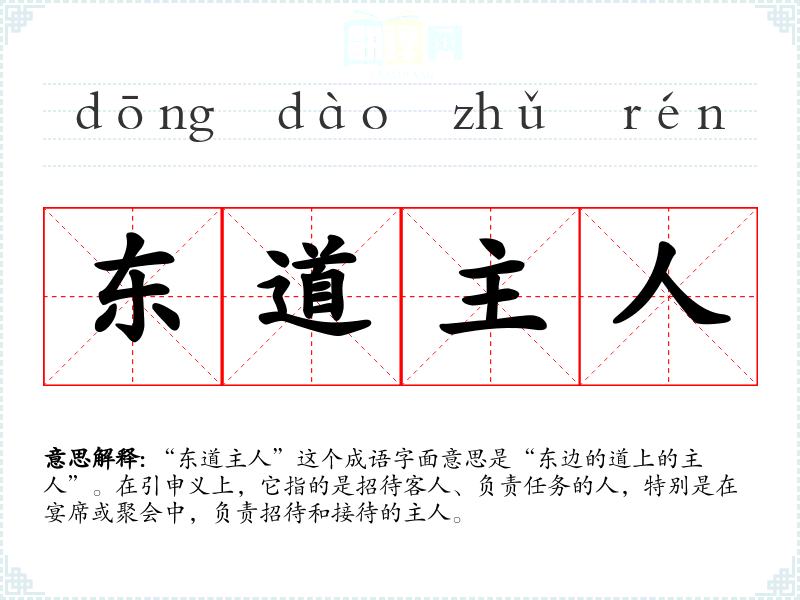“东道主人”这个成语字面意思是“东边的道上的主人”。在引申义上,它指的是招待客人、负责任务的人,特别是在宴席或聚会中,负责招待和接待的主人。