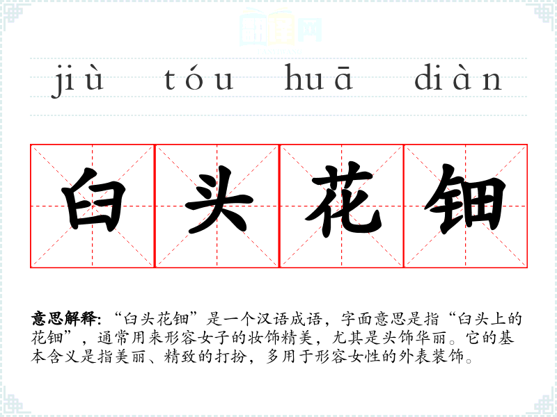 该成语源于古代*女性的妆容俗,尤其是头饰。古代女子常常使用各种精美的饰品来装扮自己,尤其是在重要场合或节庆时,体现出她们的身份和地位。因此,“臼头花钿”不仅反映了当时社会对女性美的追求,也折射出文化对于外表的重视。