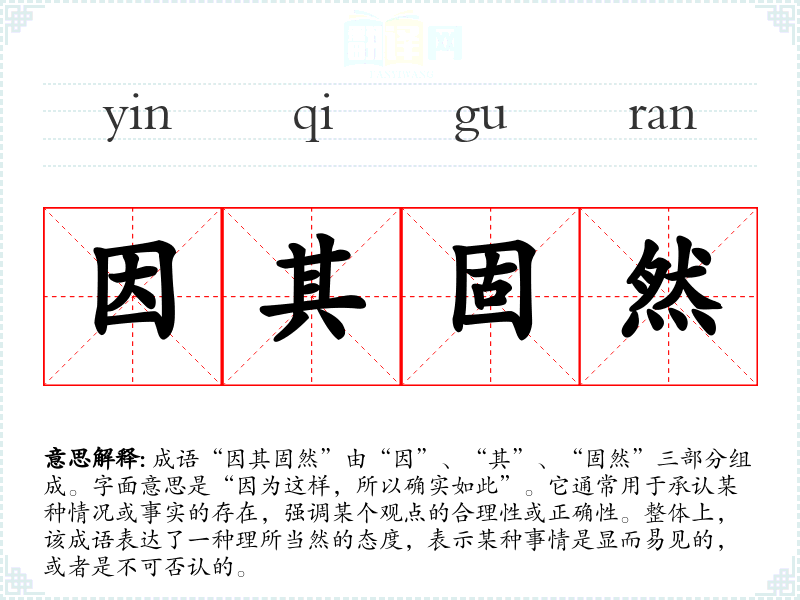 成语“因其固然”由“因”、“其”、“固然”三部分组成。字面意思是“因为这样,所以确实如此”。它通常用于承认某种情况或事实的存在,强调某个观点的合理性或正确性。整体上,该成语表达了一种理所当然的态度,表示某种事情是显而易见的,或者是不可否认的。
