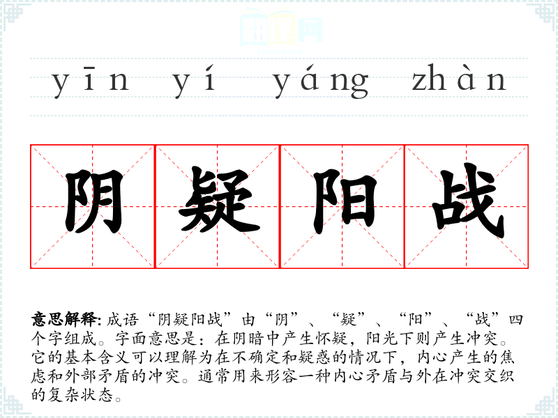 成语“阴疑阳战”由“阴”、“疑”、“阳”、“战”四个字组成。字面意思是:在阴暗中产生怀疑,阳光下则产生冲突。它的基本含义可以理解为在不确定和疑惑的情况下,内心产生的焦虑和外部矛盾的冲突。通常用来形容一种内心矛盾与外在冲突交织的复杂状态。