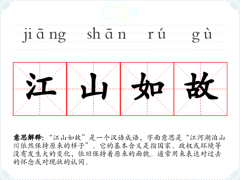 “江山如故”是一个汉语成语,字面意思是“江河湖泊山川依然保持原来的样子”。它的基本含义是指国家、政权或环境等没有发生大的变化,依旧保持着原来的面貌。通常用来表达对过去的怀念或对现状的认同。