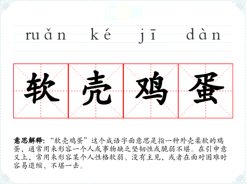 “软壳鸡蛋”这个成语字面意思是指一种外壳柔软的鸡蛋,通常用来形容一个人或事物缺乏坚韧性或脆弱不堪。在引申意义上,常用来形容某个人性格软弱、没有主见,或者在面对困难时容易退缩、不堪一击。