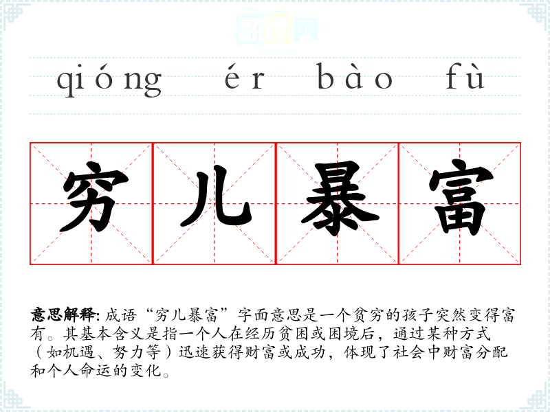 成语“穷儿暴富”字面意思是一个贫穷的孩子突然变得富有。其基本含义是指一个人在经历贫困或困境后,通过某种方式(如机遇、努力等)迅速获得财富或成功,体现了社会中财富分配和个人命运的变化。