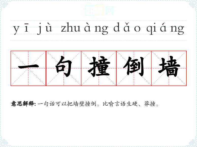 | 一语撞倒墙 | 一句话可以把墙壁撞倒。比喻言语生硬、莽撞。 |