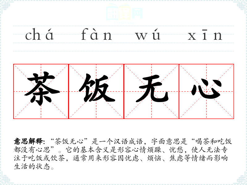 | 茶饭无心 | 没有心怀喝茶吃饭。形容心情苦闷。 |