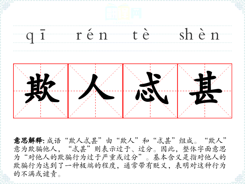 成语“欺人忒甚”由“欺人”和“忒甚”组成。“欺人”意为欺骗他人,“忒甚”则表示过于、过分。因此,整体字面意思为“对他人的欺骗行为过于严重或过分”。基本含义是指对他人的欺骗行为达到了一种极端的程度,通常带有贬义,表明对这种行为的不满或谴责。