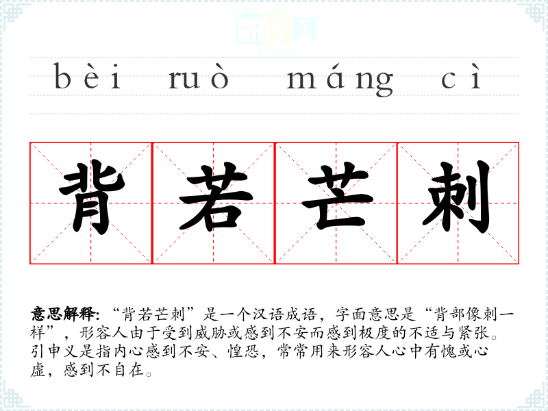 “背若芒刺”是一个汉语成语,字面意思是“背部像刺一样”,形容人由于受到威胁或感到不安而感到极度的不适与紧张。引申义是指内心感到不安、惶恐,常常用来形容人心中有愧或心虚,感到不自在。