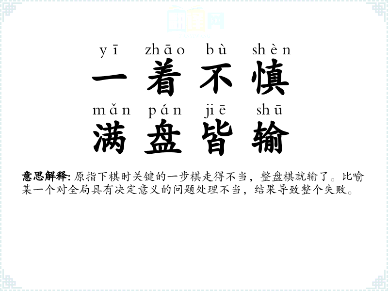 下棋时走错一步,整个棋就输掉。比喻因受某一局部的影响而使全局归于失败。 |