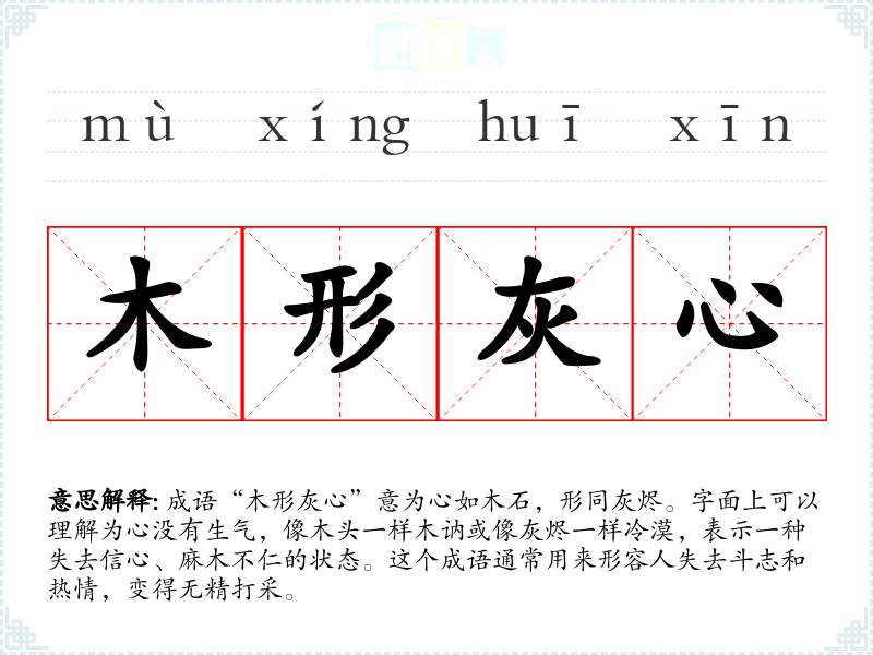 成语“木形灰心”意为心如木石,形同灰烬。字面上可以理解为心没有生气,像木头一样木讷或像灰烬一样冷漠,表示一种失去信心、麻木不仁的状态。这个成语通常用来形容人失去斗志和热情,变得无精打采。