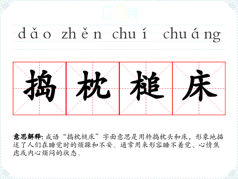 - 辗转反侧:形容因心中烦闷而无法入睡,与“捣枕槌床”有相似的含义。