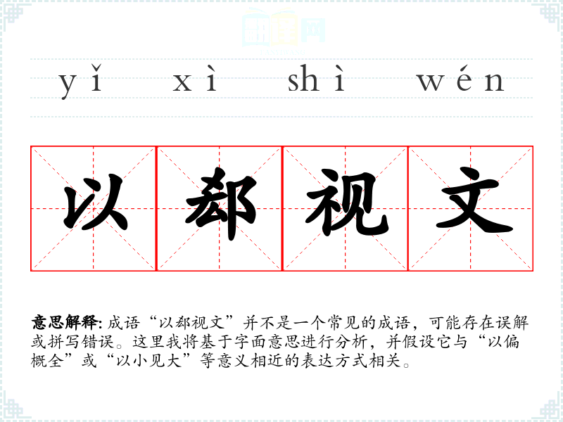 成语“以郄视文”并不是一个常见的成语,可能存在误解或拼写错误。这里我将基于字面意思进行分析,并假设它与“以偏概全”或“以小见大”等意义相近的表达方式相关。