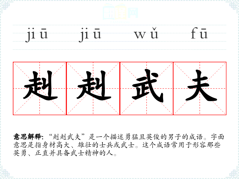 “赳赳武夫”是一个描述勇猛且英俊的男子的成语。字面意思是指身材高大、雄壮的士兵或武士。这个成语常用于形容那些英勇、正直并具备武士精神的人。
