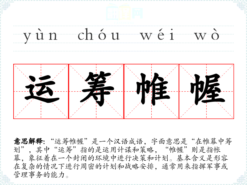 “运筹帷幄”是一个汉语成语,字面意思是“在帷幕中筹划”,其中“运筹”指的是运用计谋和策略,“帷幄”则是指帐幕,象征着在一个封闭的环境中进行决策和计划。基本含义是形容在复杂的情况下进行周密的计划和战略安排,通常用来指挥军事或管理事务的能力。