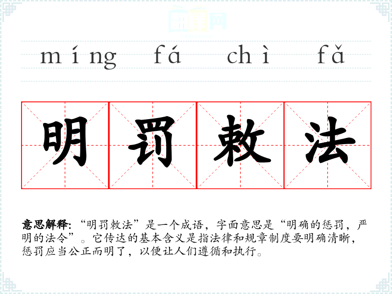 “明罚敕法”是一个成语,字面意思是“明确的惩罚,严明的法令”。它传达的基本含义是指法律和规章制度要明确清晰,惩罚应当公正而明了,以便让人们遵循和执行。