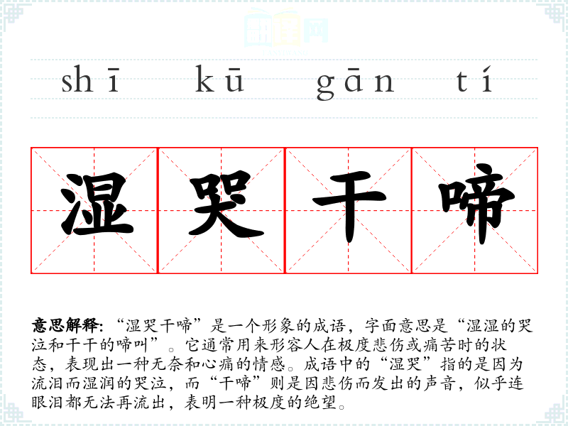 “湿哭干啼”并没有明确的历史典故或固定的文学出处,但其表达的情感状态常见于古代诗词中,尤其是表现离别、失落等主题的作品。可以推测,这一成语体现了一种普遍的人类情感,可能在民间流传中逐渐形成。