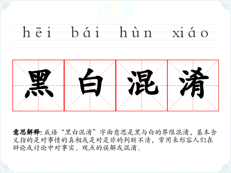 成语“黑白混淆”字面意思是黑与白的界限混淆,基本含义指的是对事情的真相或是对是非的判断不清,常用来形容人们在辩论或讨论中对事实、观点的误解或混淆。