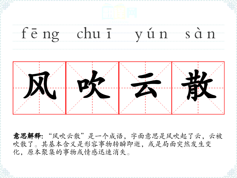 “风吹云散”是一个成语,字面意思是风吹起了云,云被吹散了。其基本含义是形容事物转瞬即逝,或是局面突然发生变化,原本聚集的事物或情感迅速消失。