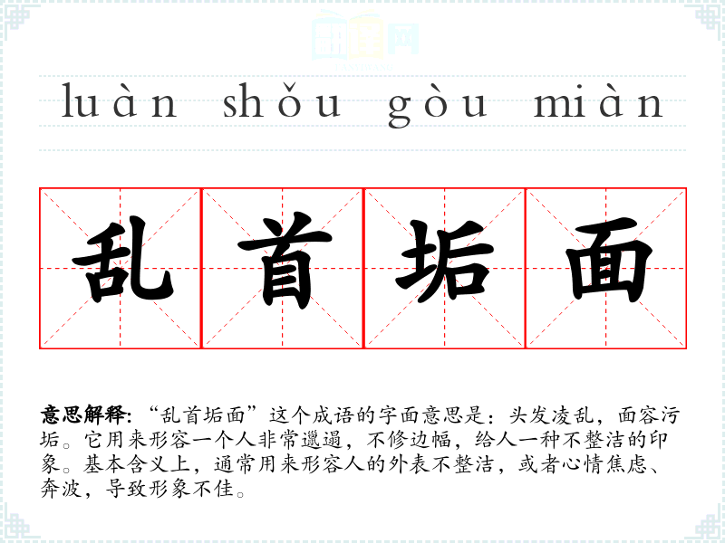 “乱首垢面”这个成语的字面意思是:头发凌乱,面容污垢。它用来形容一个人非常邋遢,不修边幅,给人一种不整洁的印象。基本含义上,通常用来形容人的外表不整洁,或者心情焦虑、奔波,导致形象不佳。