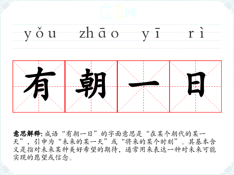 成语“有朝一日”的字面意思是“在某个朝代的某一天”,引申为“未来的某一天”或“将来的某个时刻”。其基本含义是指对未来某种美好希望的期待,通常用来表达一种对未来可能实现的愿望或信念。