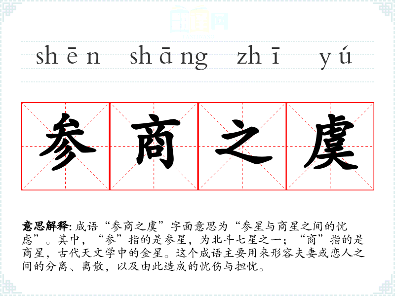 成语“参商之虞”字面意思为“参星与商星之间的忧虑”。其中,“参”指的是参星,为北斗七星之一;“商”指的是商星,古代天文学中的金星。这个成语主要用来形容夫妻或恋人之间的分离、离散,以及由此造成的忧伤与担忧。