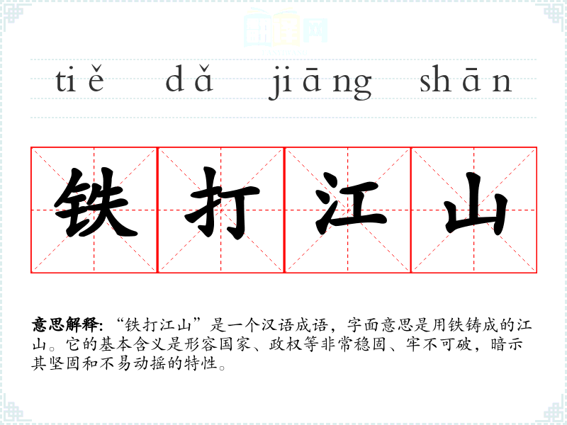 “铁打江山”是一个汉语成语,字面意思是用铁铸成的江山。它的基本含义是形容国家、政权等非常稳固、牢不可破,暗示其坚固和不易动摇的特性。
