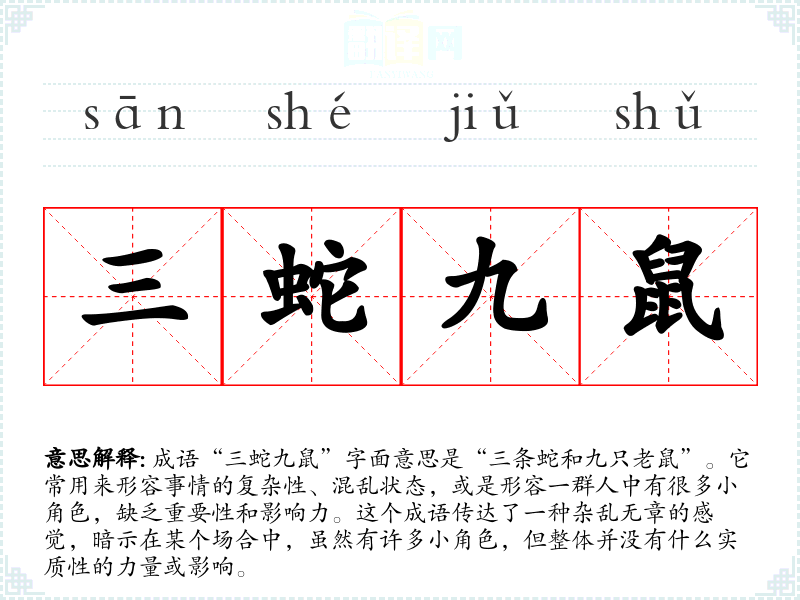 成语“三蛇九鼠”字面意思是“三条蛇和九只老鼠”。它常用来形容事情的复杂性、混乱状态,或是形容一群人中有很多小角色,缺乏重要性和影响力。这个成语传达了一种杂乱无章的感觉,暗示在某个场合中,虽然有许多小角色,但整体并没有什么实质性的力量或影响。
